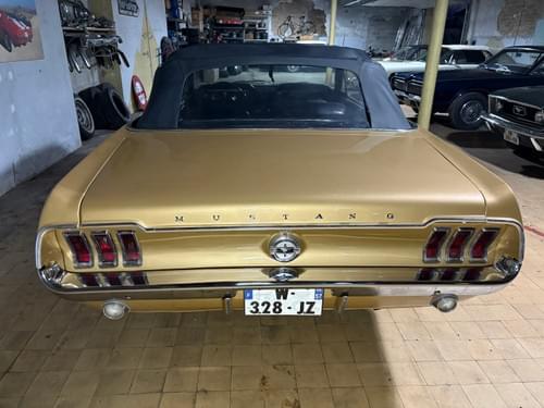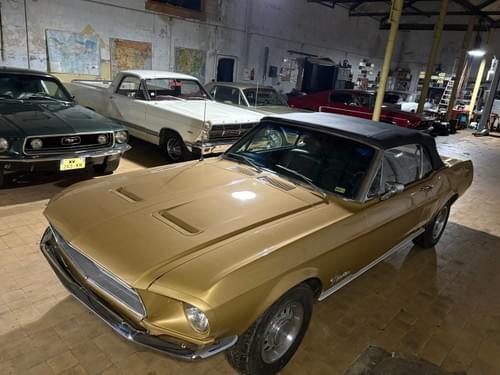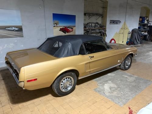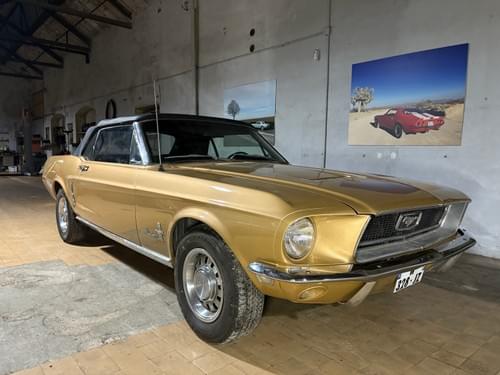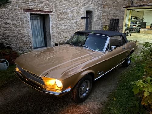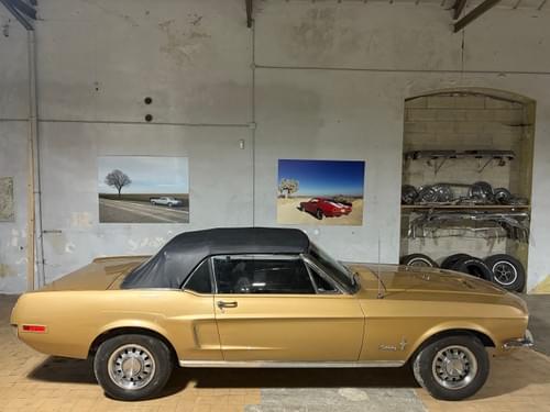 Rare Mustang code J (302 4V) toute d'origine. Sunlit Gold, couleur uniquement proposée en 1968. Super saine, sans corrosion. Peinture neuve. Nombreuses options : capote électrique neuve, console centrale, freins à disques assistés, boite automatique, direction assistée, exterior decor group. Révisée. Très belle auto !